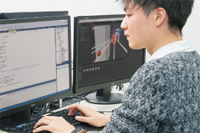 現在ゲームの主流である「3Dゲーム」。現実さながらの物理法則がプログラムされることで、“現実を遥かに超えた演出”がゲームの中に創造・実現されます。プログラミング能力に加え、物理・数学への理解が現在のプログラマーに求められています。